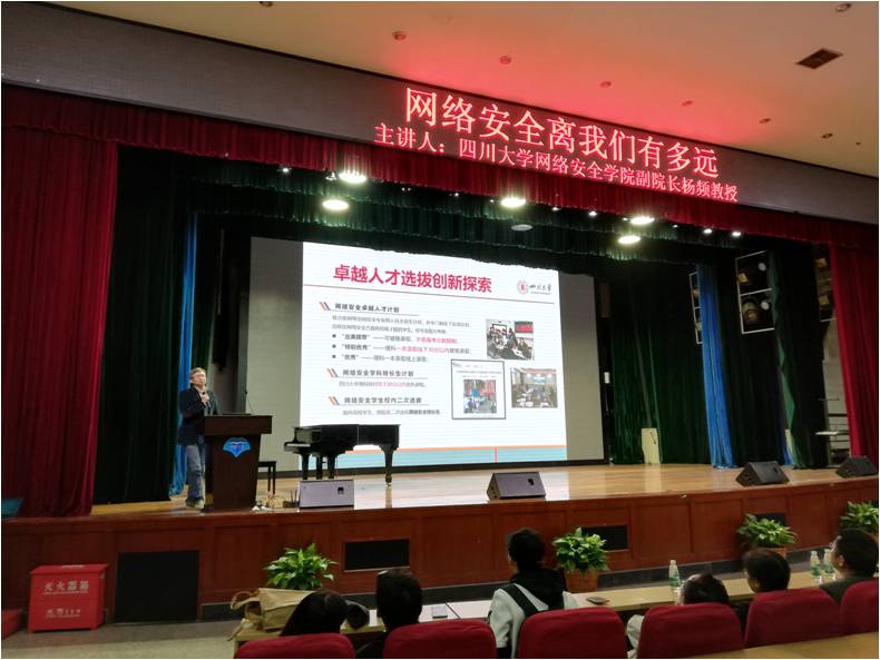 永利集团88304官网于10月25日晚到成都第七中学林荫校区,面向高一年级全体教师和同学以及部分高二同学进行了一场名为“网络安全离我们有多远”的专题讲座。第七中学毛道生副校长、马健副校长、年级组长李雪娜老师和高一年级全体教师和同学以及部分高二同学和家长代表参加了讲座;永利集团88304官网招生就业处廖爱民副处长、永利集团88304官网秦燕副院长、刘嘉勇副院长、杨频副院长和教师代表赵辉老师、刘亮老师等多位老师和2018级“卓越人才计划”新生代表朱家迅同学出席了讲座。杨频副院长就讲座内容为大家做了精彩的演讲。