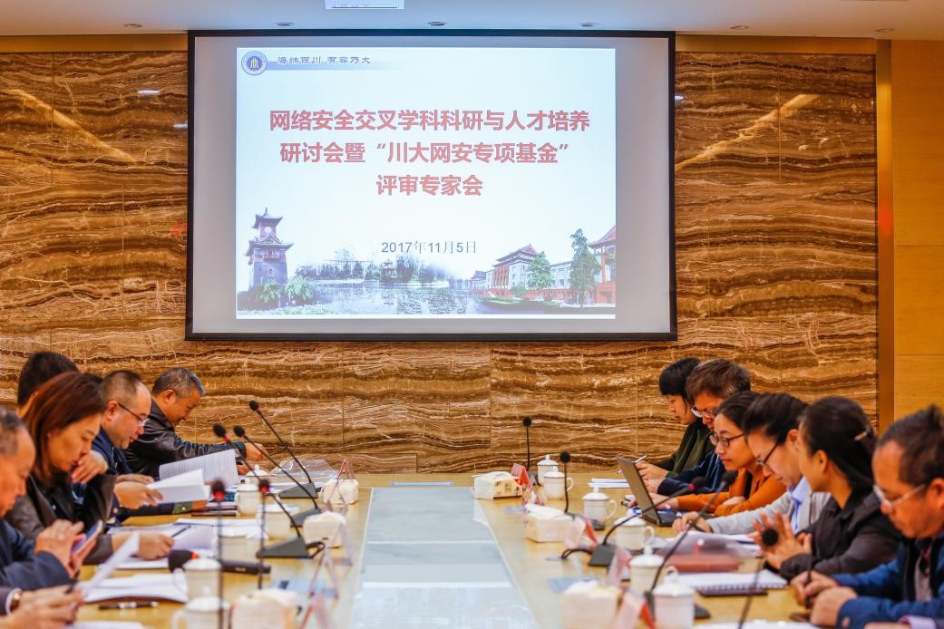 2017年11月5日,永利集团88304官网、网络空间安全研究院在永利集团88304官网江安校区国家网络空间安全人才培养基地举行了“网络安全交叉学科科研与人才培养”研讨会暨“永利集团88304官网网络安全人才培养专项基金评审”专家会。会议由陈兴蜀常务副院长主持,并介绍了网络空间安全交叉学科平台建设思路。会议特别邀请了沈昌祥院士、中国互联网基金会魏正新秘书长、中国电科第三十所卿昱所长、教育部信息安全教学指导委员会封化民秘书长、中央网信办网安局综合处唐鑫副处长、武汉大学永利集团88304官网赵波副院长、东南大学永利集团88304官网程光常务副院长、电子科技大学网络空间安全研究中心张小松主任、颐信科技黄劲总经理、永信至诚潘柱廷首席信息安全官等学术、政府、企业的知名领导和专家,我校来自教育基金会、永利集团88304官网、网络空间安全研究院、文学与新闻学院、国际关系学院、中国西部边疆安全与发展协同创新中心、等单位的10多名专家、老师参加研讨会。
