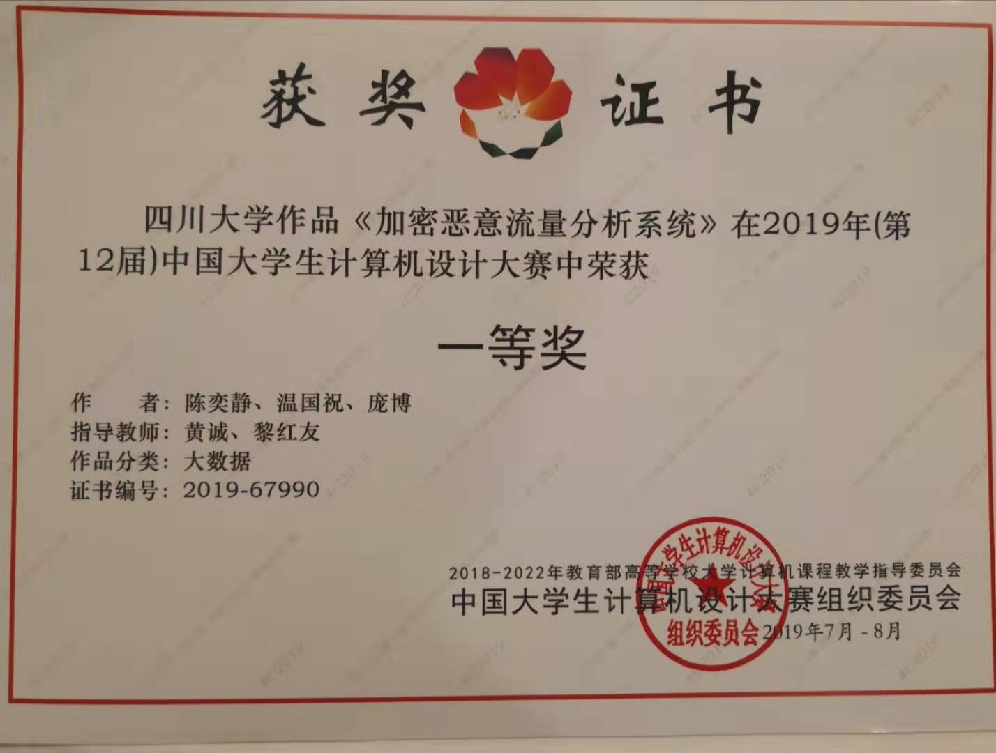 整个参赛过程中得到了学院领导们的高度重视与支持,由陈奕静、温国祝、庞博同学组成的永利官网参赛队伍,在黄诚老师、黎红友老师的悉心指导下队员们开拓创新,刻苦实践,完成的作品“加密恶意流量分析系统”,经过了四川省级赛的展示答辩,顺利晋级国赛,并在国赛中得到了评委老师的高度认可。