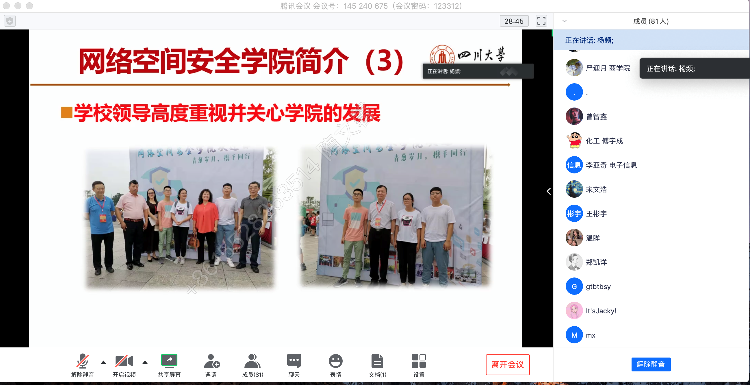 会议首先由杨频副院长进行转专业宣讲,杨院长以案例分析和故事讲述的方式带领意愿转专业的同学们了解网络空间安全专业,他通过呈现遭受网络安全威胁的相关案例如驻外机构遭受攻击、在线会议泄露隐私、伊朗核电站震网事件等,让同学们深刻理解维护网络空间安全对于社会稳定和国家安全的重要意义。在此背景下,杨院长从学院发展和专业特色角度介绍了学院概况、师资队伍、教学能力、硬件设施、实践基地、学科建设、就业情况等相关信息,并详细解释了学院转专业实施细则、申请条件和考核方式,使同学们能够在了解专业特色的基础上明确转入网安专业的要求。
