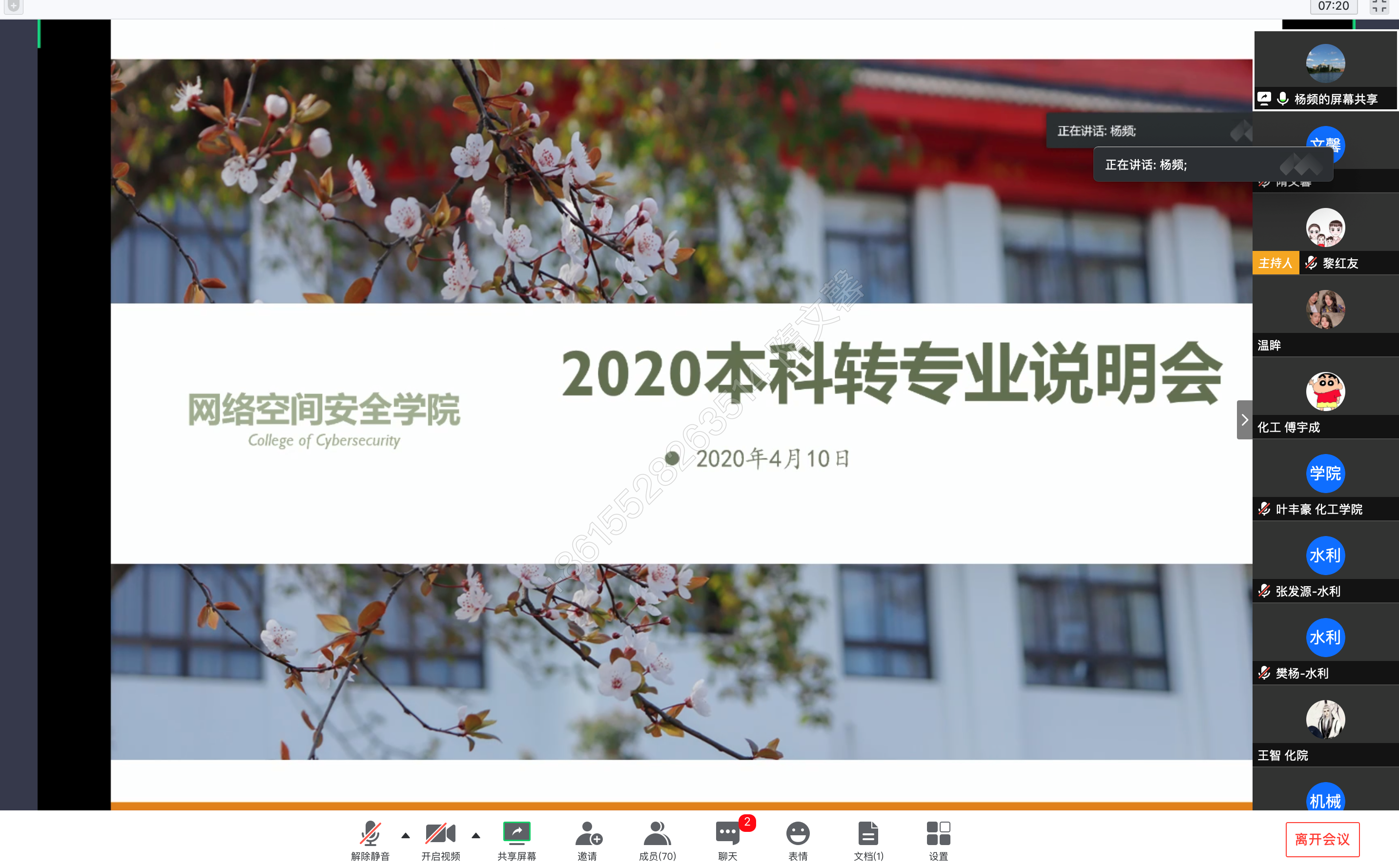 为了让有转专业意愿的同学深入了解网络空间安全专业,保障学院转专业学生交接工作的顺利完成,4月11日上午,永利集团88304官网通过在线会议的方式召开2019年度转专业宣讲会,学院直属支部书记兼副院长秦燕、副院长杨频、学生科科长黎红友、教务科科长方智阳等老师和80余位意愿转专业的同学参加了本次会议。