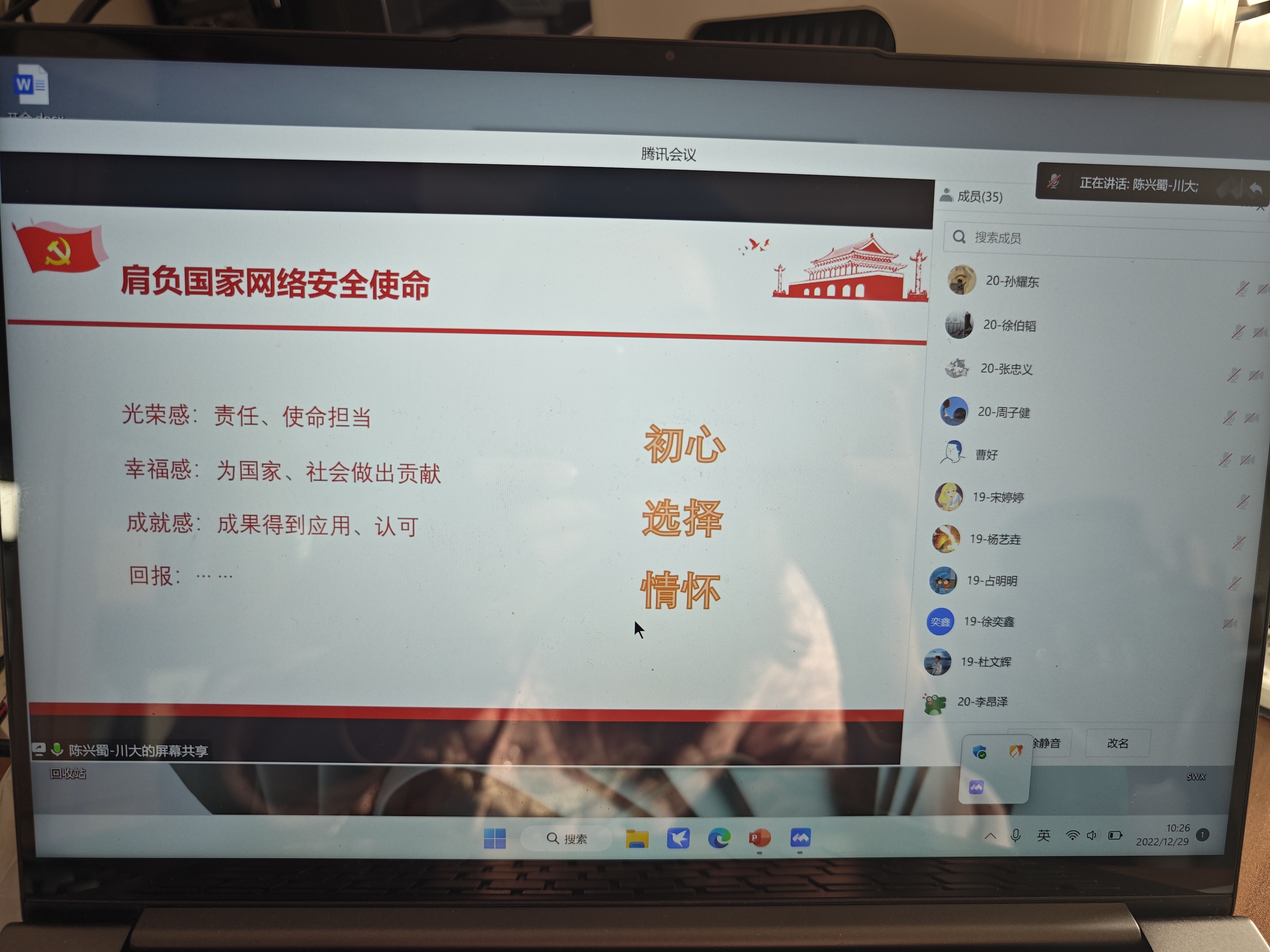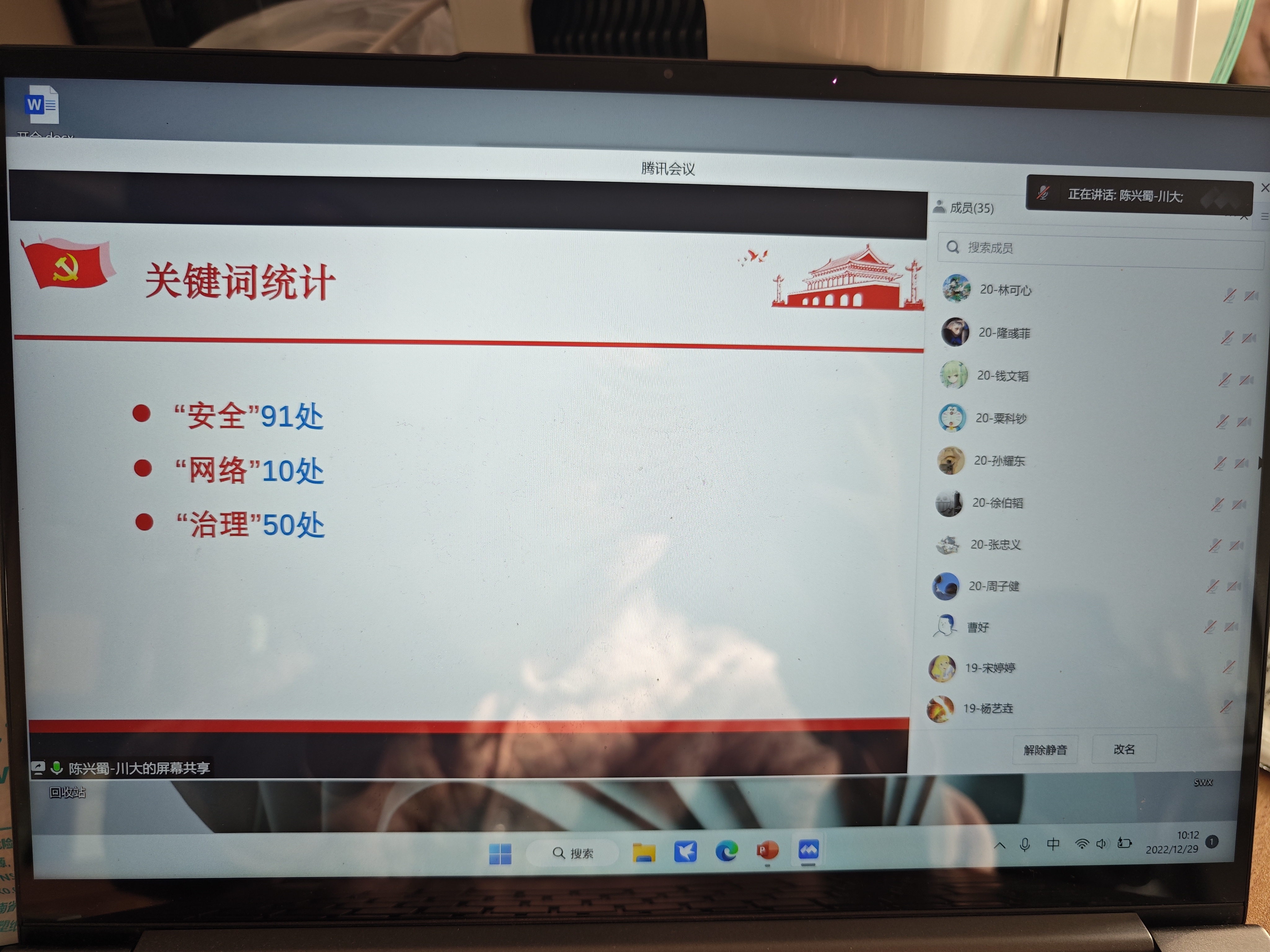 陈院长对二十大精神进行了深入解读,指导全体党员同志深入学习领会、贯彻落实党的二十大精神。陈院长对二十大报告中的三个关键词“安全”“网络”“治理”出现的次数进行了统计,由此强调了网络空间安全和网络治理的重要性。