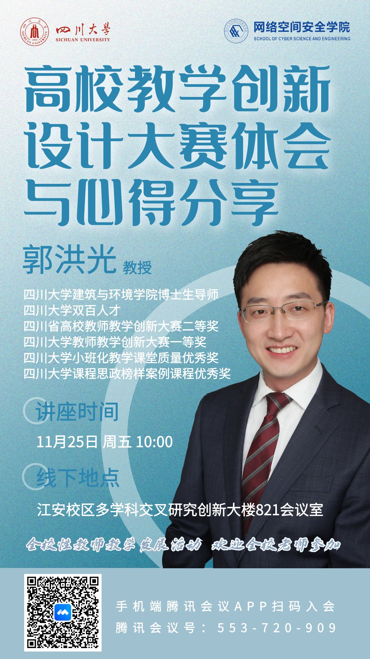 11月25日,永利官网在江安校区多学科交叉研究创新大楼821会议室成功开展永利集团88304官网教师教学发展活动——预热第六届教师教学创新大赛,学院邀请到了建筑与环境学院郭洪光教授作为主讲嘉宾,以“高校教师教学创新大赛体会与心得分享”为主题,带领老师们深入了解教师教学创新大赛的备赛要求和参赛经验。活动由学院副院长杨频主持,学院的30多位老师在线上线下同时参加了此次活动。