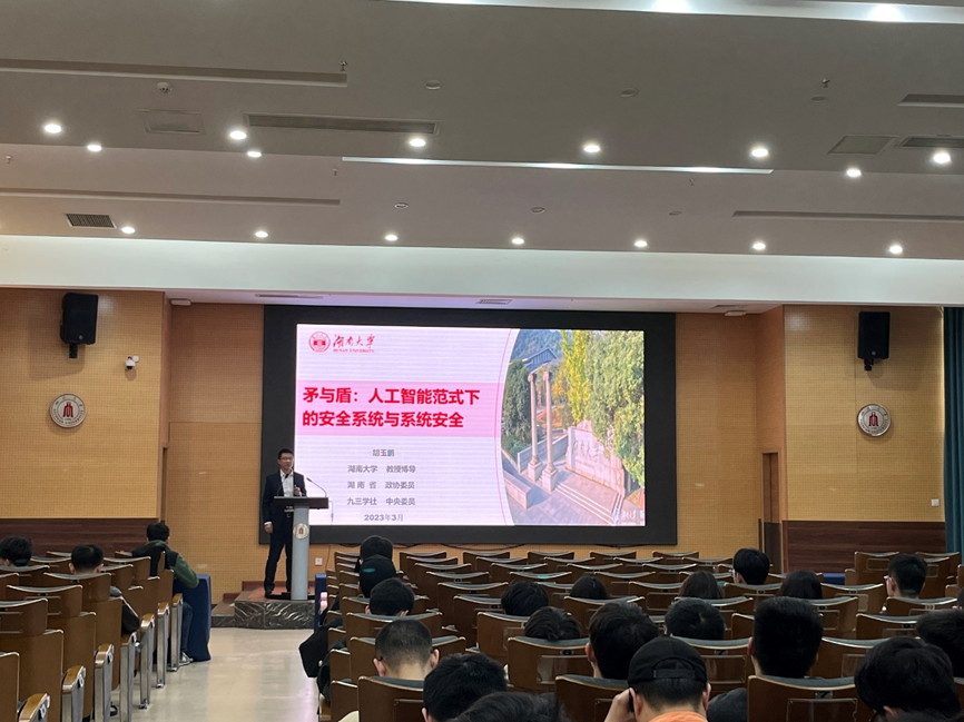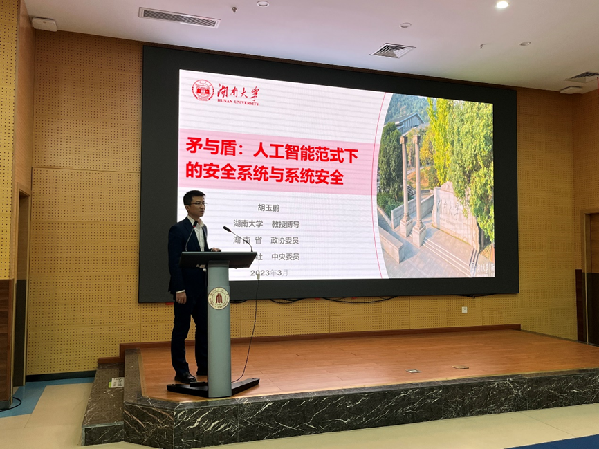 2023年3月9日上午。学院邀请了湖南大学信息科学与工程学院胡玉鹏教授在线下为永利集团88304官网师生带来了一场题为“矛与盾:人工智能范式下的安全系统与系统安全”的学术讲座。
