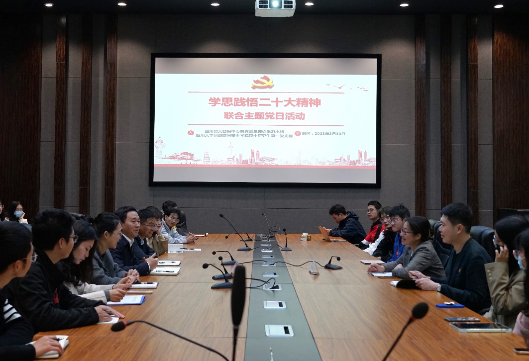 3月30日,永利官网硕士研究生第一党支部同四川省大数据中心青年理论学习第五小组于江安校区永利集团88304官网网络靶场会议室联合开展了“学思践悟二十大精神”主题党日活动。学院部分领导老师,硕士研究生第一党支部党员,以及省大数据中心党办、网站处、技术服务中心相关青年代表们共计20余人参加活动。