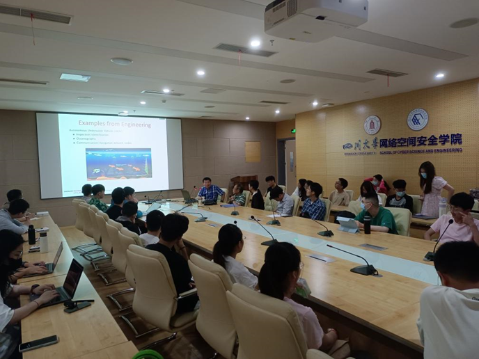 讲座会上,Xinzhi Liu教授从现实生活中的鱼群、蝗虫群和萤火虫同步闪烁出发,再到工程应用中的自主水下航行器和无人机等,详细说明了多智能体系统研究的重要性。再从多智能体系统的建模、编队控制和蔽障三方面进行了详细讲解与分析。最后,Xinzhi Liu教授与青年教师和硕博士研究生就报告内容进行了热烈的讨论和交流,Xinzhi Liu教授还对有意出国学习的同学进行了详细指导。