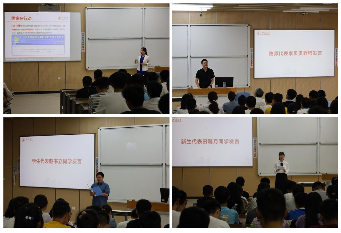 陈兴蜀首先代表学院全体师生欢迎新同学的到来。随后以国家安全为主题,从多个方面介绍了网络安全的社会需求、就业情况以及学院学生的发展和成就。陈兴蜀鼓励新同学树立新的前进目标,成为国家栋梁之才。