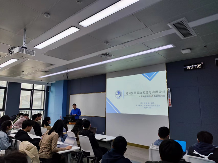 在此次引人入胜的学术讲座中,时教授以大众如何受到暗网影响为出发点,由浅入深地阐述了暗网的基本原理和关键技术特性。时教授首先明确了暗网的基础概念和核心技术特点,随后详细解读了暗网的定义、内涵以及其发展历程。时教授深入探讨了当前暗网技术与其它旨在规避监管的网络技术日益融合的趋势,分析了在“暗网即地下网络空间”时代下安全受到的挑战及应对策略,细致讨论了暗网空间测绘和威胁溯源方面遇到的困难与问题,并提出了相关威胁的一些溯源方案。此外,时教授针对暗网相关的研究工作及其体系化研究提供了实际的建议。在讲座的尾声,他还分享了他的研究团队的主要研究方向和成果,并耐心回答了学生们的提问。