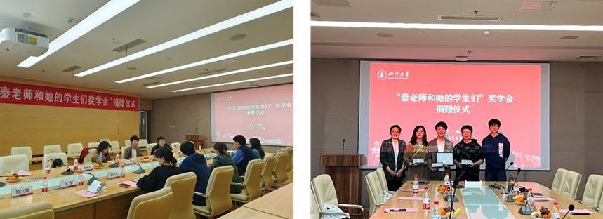 2024年3月29日上午,永利集团88304官网“秦老师和她的学生们奖学金”捐赠仪式在江安校区多学科交叉研究创新大楼举行。2007级优秀校友吴文东、但境宇携杭州乐见科技有限公司,为感念母校及老师,捐赠一百万元奖学金,助力学院教育事业发展。