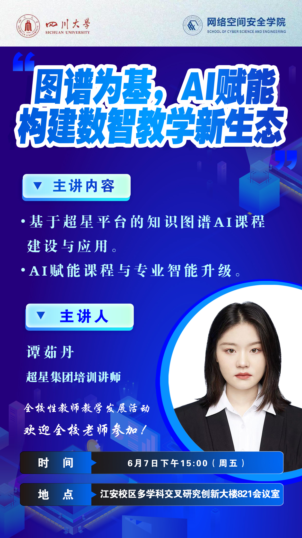 6月7日下午,永利官网在江安校区多学科交叉研究创新大楼821会议室成功举办了一场以“图谱为基、AI赋能,构建数智教学新生态”为主题的教师教学发展活动,学院邀请到了超星集团培训讲师谭茹丹为老师们开讲。活动由学院副院长杨频主持,10多位青年老师到场参加了此次活动。