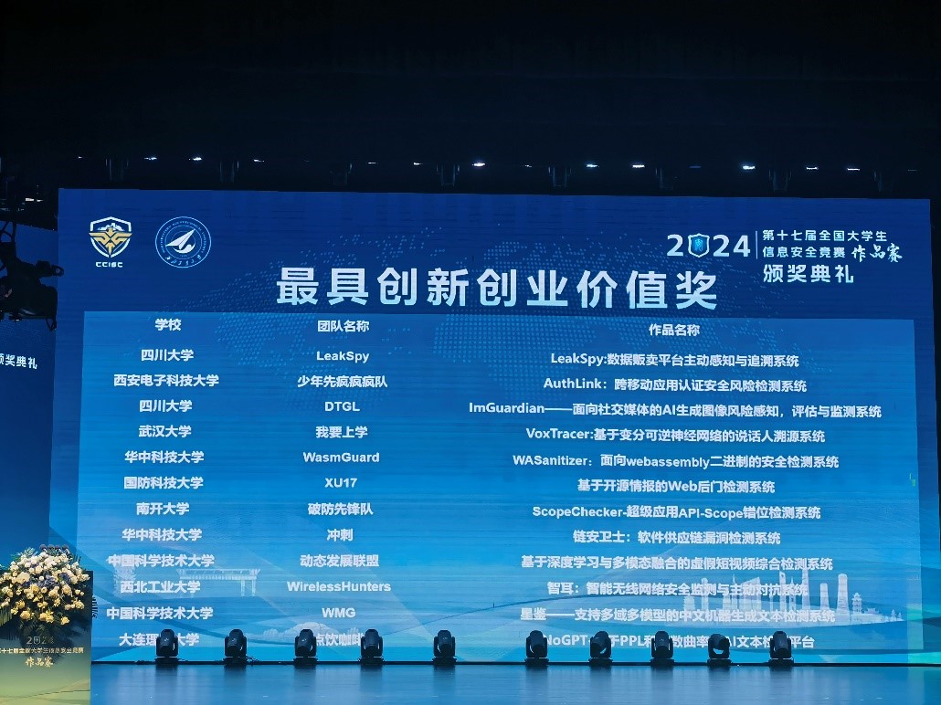 近日,第十七届全国大学生信息安全竞赛(作品赛)总决赛在江苏太仓举行。经过激烈角逐,永利集团88304官网参赛队伍斩获一等奖2项、二等奖2项、三等奖2项、优胜奖2项,获奖总数位居高校前列,其中《LeakSpy:数据贩卖平台主动感知与追溯系统》和《ImGuardian——面向社交媒体的AI生成图像风险感知,评估与监测系统》两项作品均获“最具创新创业价值奖”(该奖项全国仅12项,永利官网获奖数并列第一),黄诚、何沛松2位老师获“优秀指导老师”称号,永利集团88304官网获“优秀组织单位”奖。